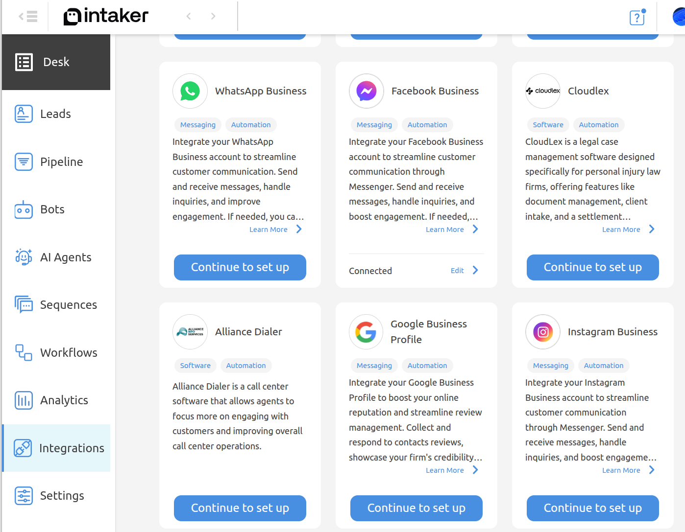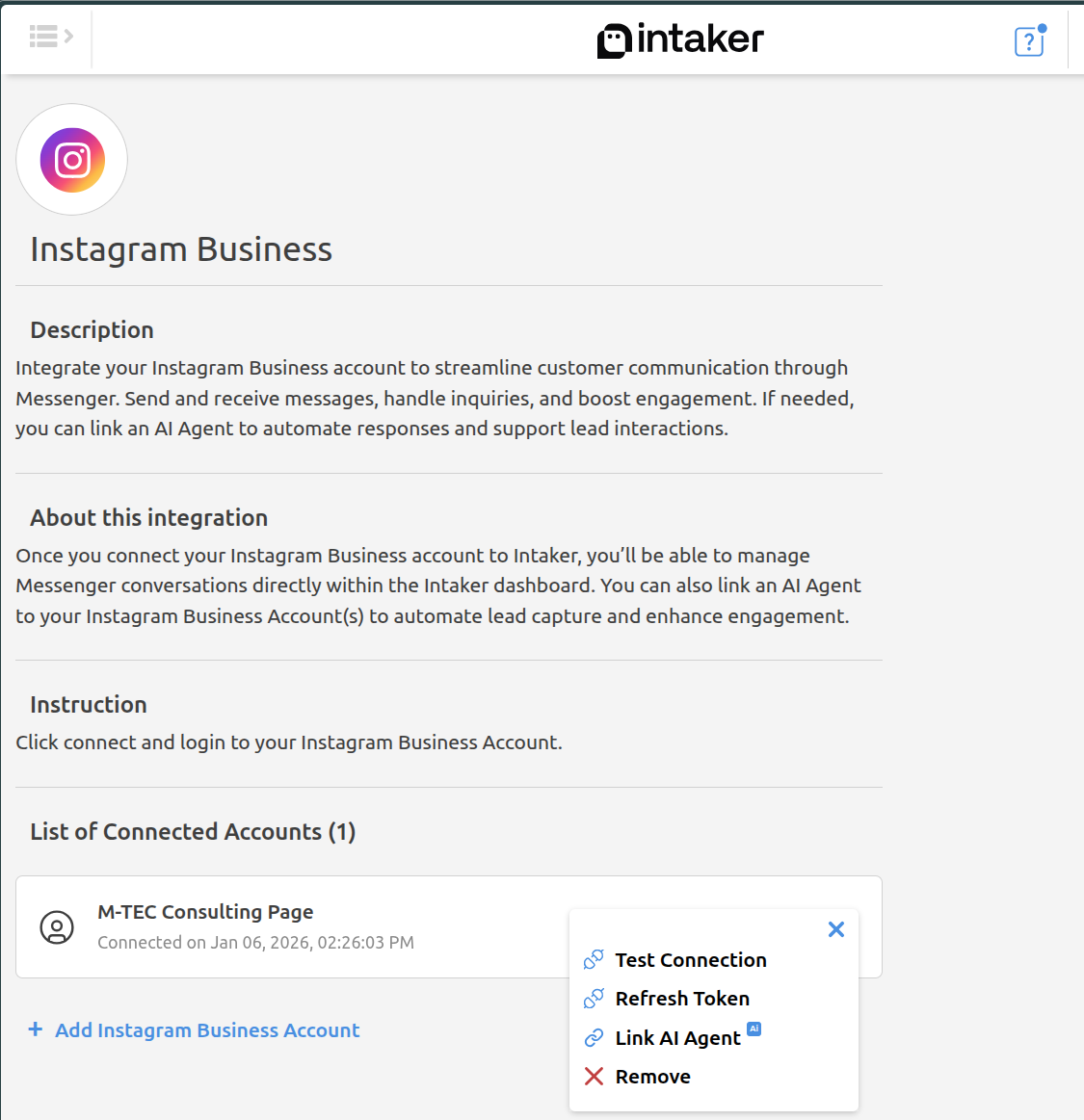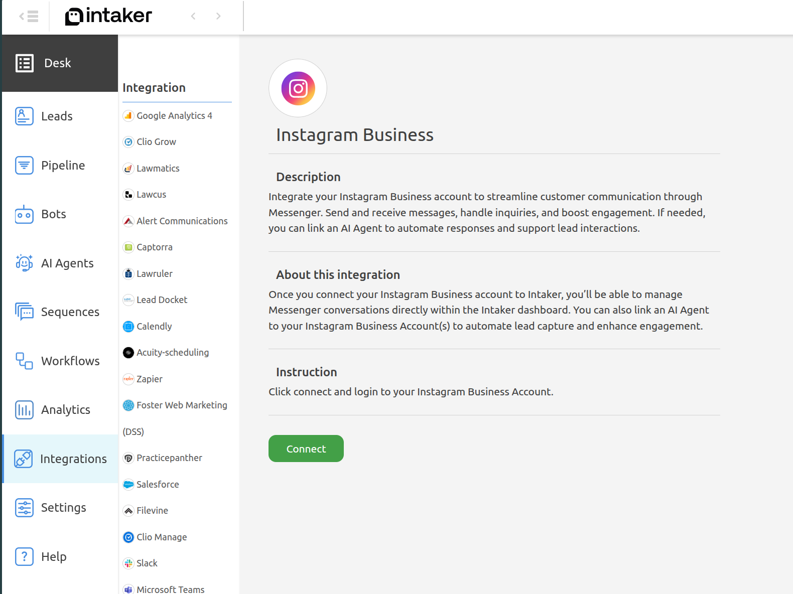 - Select the Instagram Business Integration in the Intaker Dashboard: