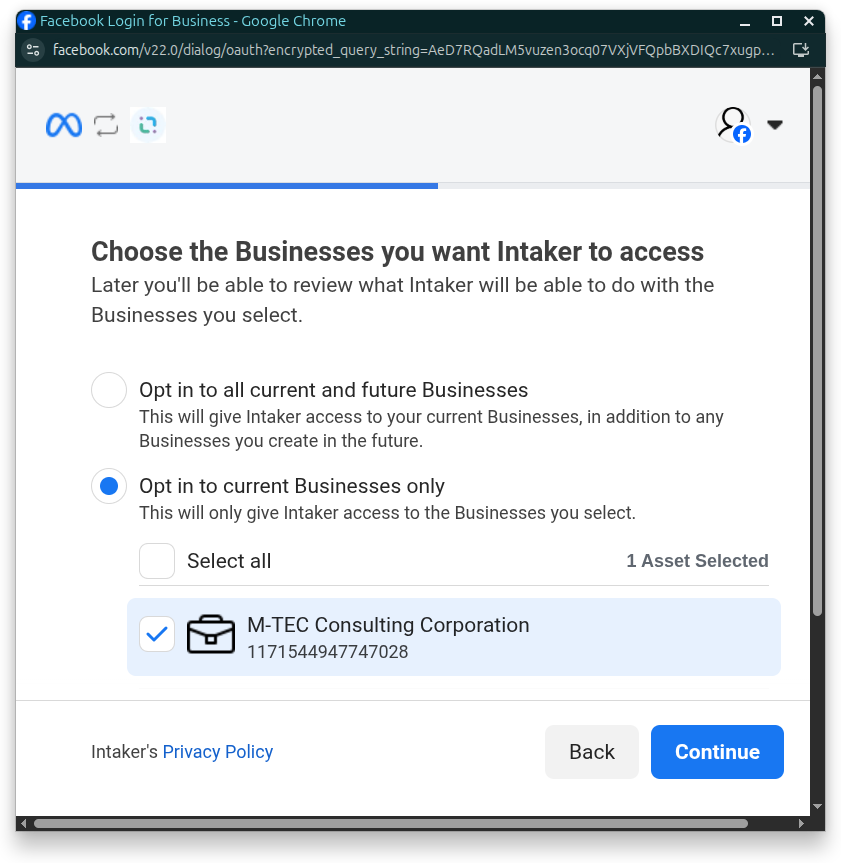 - Select your business portfolio. If you do not have a business portfolio, select “Opt in to all current and future Businesses”.